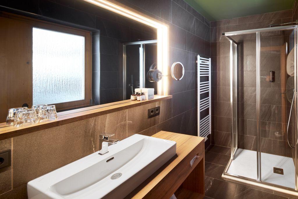 moderne Suite mit Panoramablick in unserem Posthaus (Nebengebäude mit unterirdischer Verbindung zum Haupthaus), Dusche, WC, Kabel-Tv, W-Lan, Telefon, Safe und Föhn, rundes - drehbares Sofa (1,60m lang, Schlafsofa für Kinder) und Balkon.